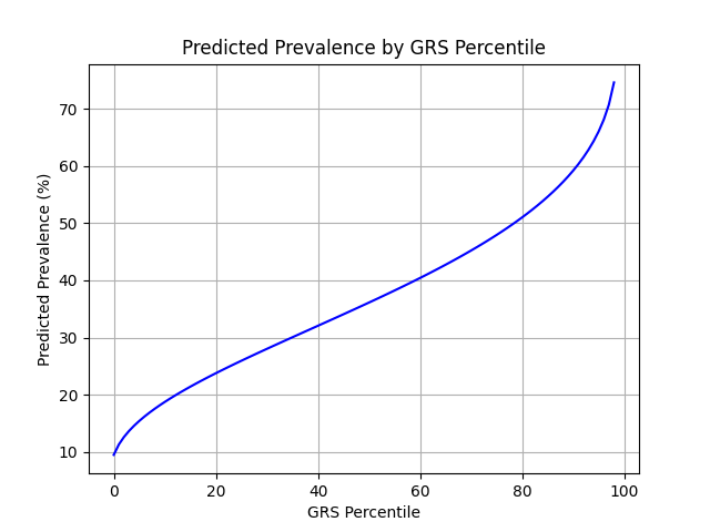 UKB participants tend to be healthier than the general population, which leads to lower observed disease prevalence.[12] Weng et al. estimate a 37.1% lifetime risk of atrial fibrillation for individuals over age 55, much higher than the prevalence in the UKB.[10] We adjust our model so that its average predicted risk aligns with this estimate (see Figure 2).[13] People at the tail end of the GRS distribution were at an elevated risk compared to the mean (see Table 3), with adults in the 99th percentile 2.0x more likely to develop atrial fibrillation than average (74.6% vs 37.1%).